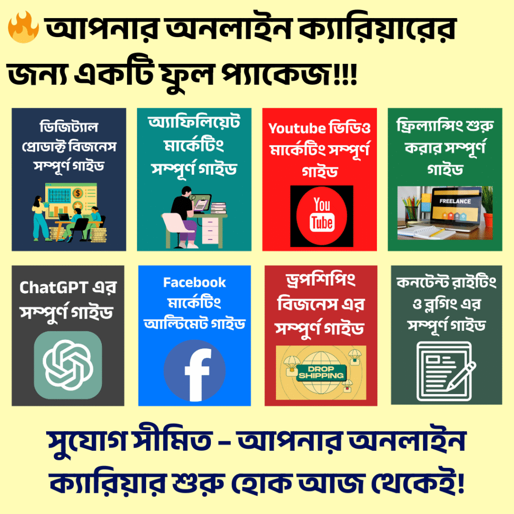 👉 ডিজিটাল প্রোডাক্ট, ড্রপসিপিং, এফিলিয়েট, ইউটিউব, ফ্রিল্যান্সিং, ফেসবুক অ্যাডস, চ্যাটজিপিটি — সব একসাথে, কোনো অতিরিক্ত খরচ নেই।
